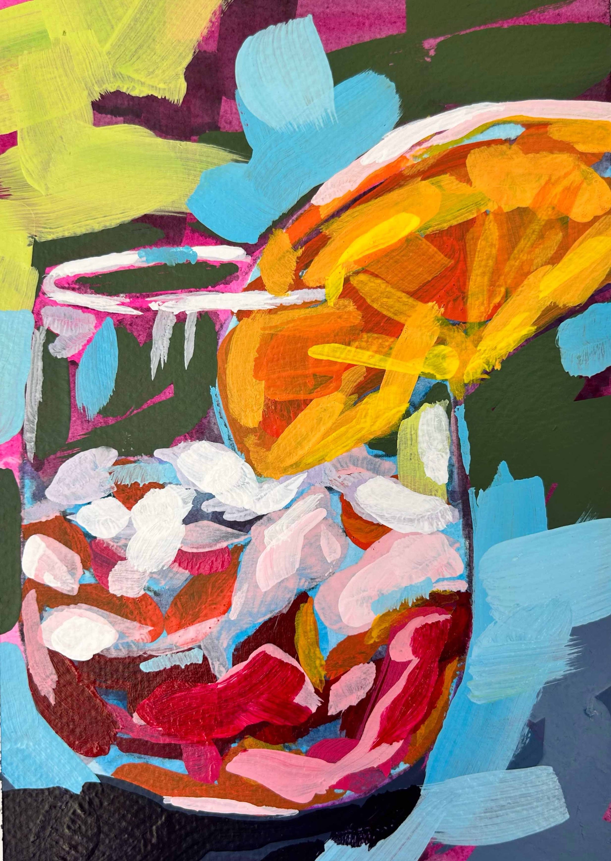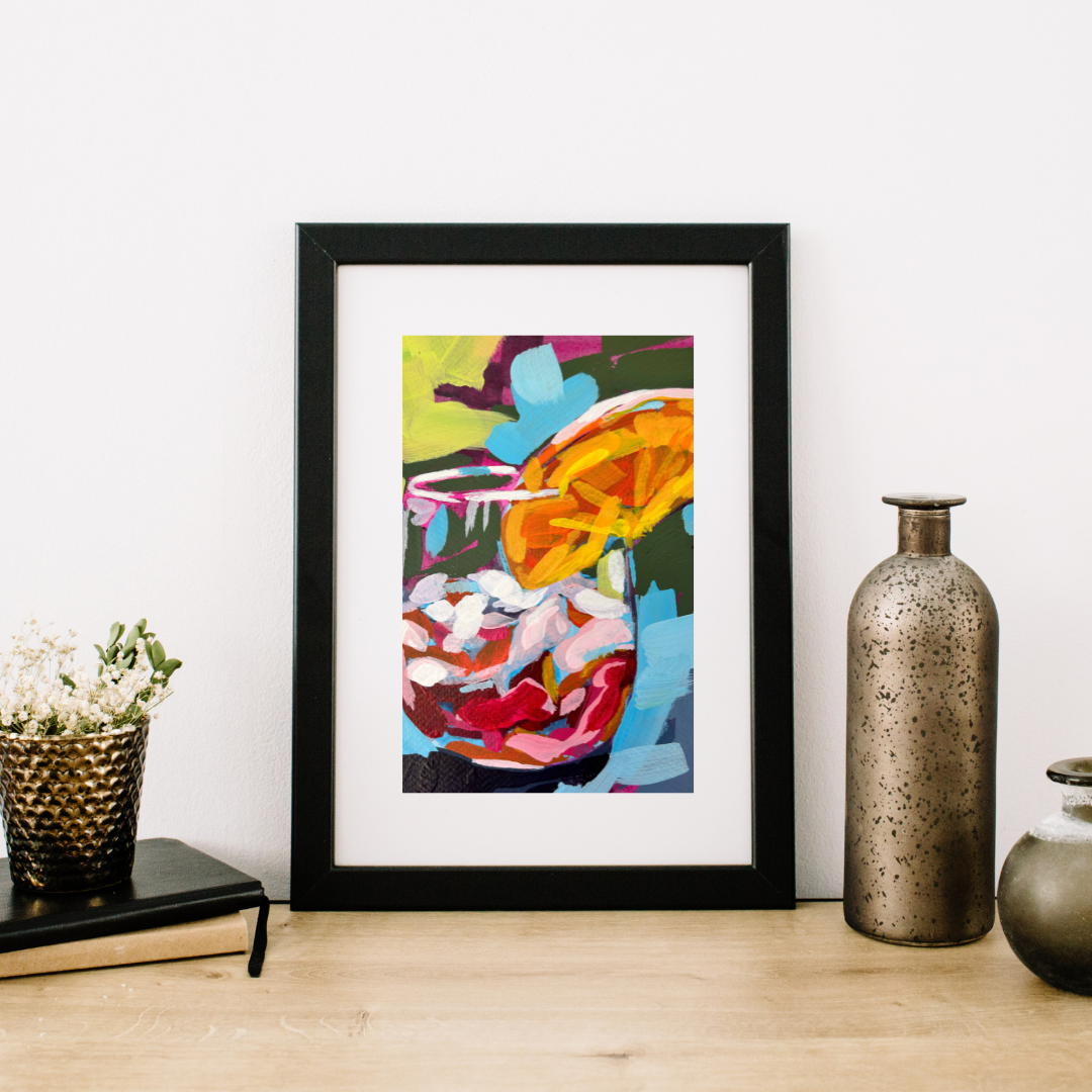 Bold strokes of color to capture light and life. This art print is created from my original painting and is printed on 32lb matte paper. This print arrives in a white mat and is unframed - frame not included. Inspired from a drink series with Ali Kay Studios.